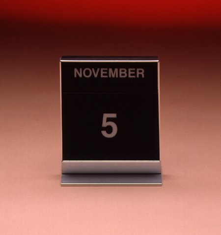 Shown in Satin Chrome. Single-sided, Upright Calendar with magnetic Calendar Plaques.